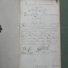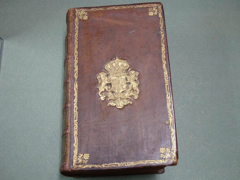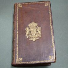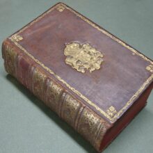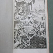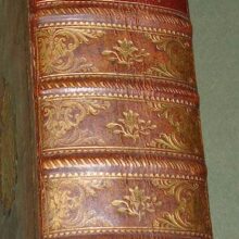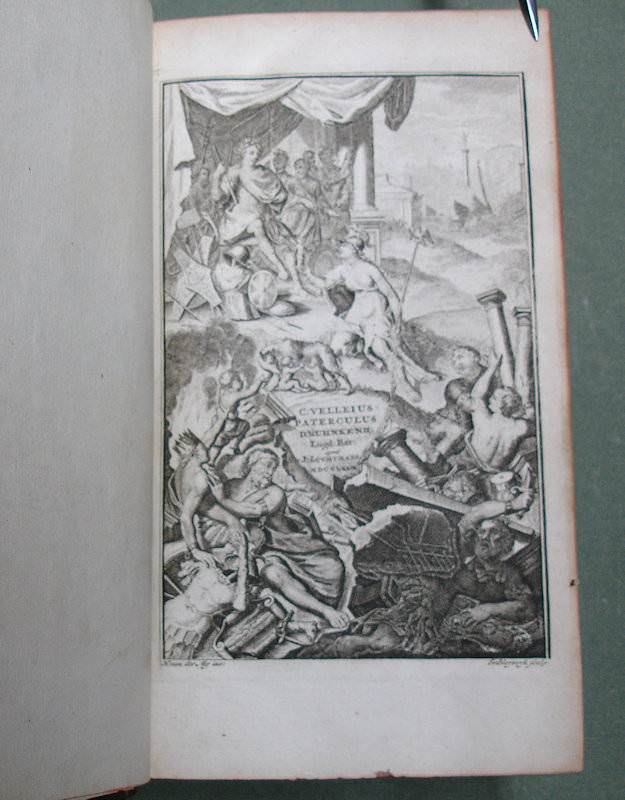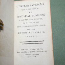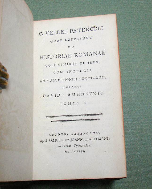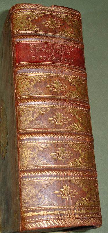 8vo. 2 volumes in 1: (II, frontispiece),(XXXII),CXXII,1262 (recte 1260),(99 index) p. Calf 21 cm (Ref: STCN ppn 241048281; Schweiger 2,1130: a long note, from which :’Sehr wichtige Ausgabe’; ‘an offenbar corrupten Stellen nahm er Emendationen, fremde und eigene, auf’. ‘Die Notae des Rhenanus und Burer liess er unverstümmelt unter dem Texte abdrücken und fügte ihnen seine Anmerkungen … neue Emendationen .. hinzu’. ‘Der zweite Theil enthält den vollständigen Apparat der Burmannischen Ausgabe’; Dibdin 2, 525: ‘a very excellent edition’; The text is ‘amended in many passages by the judgement of Ruhnkenius, and not according to the fanciful suggestions of preceeding editors’; Brunet 4,430: ‘Très bonne édition’; Ebert 23482: ‘Diese Ausgabe ist ein whares Muster krit. Tacts und grammat. Gelehrsamkeit, und bis jetzt die beste’. J. Bernays, ‘Geschichte der klassischen Philologie, Hildesheim, 2008, p. 144: ‘jetzt (ca. 1880) noch ausgezeichnet’; Spoelder p. 677, Tiel 1) (Details: Prize copy, including the manuscript prize dated 3rd july 1801 for Romboldus Brenkman Pitlo. Back gilt elaborately, and with 5 raised bands. Red morocco shield in the second compartment. Other compartments filled with gilt floral motives. Borders of the boards also ruled gilt with floral motives, and floral corner pieces. Gilt coat of arms of Tiel on both boards. Edges dyed red.The frontispiece designed by H. van der My and executed by F. v. Bleyswyk, depicting Rome, personified by an emperor, as a stronghold against chaos, under the protection of the Gods; in the middle stands the wise goddess Athena; she holds in her right hand the Palladion; Athena is the ‘aquilifer’ (Eagle-bearer) of Rome, for in her left hand she holds the ‘Aquila’, the standard of the Roman army; with a long chain she holds the destructive forces of civil war and chaos under control) (Condition: Corners slightly bumped. Head of spine very slightly damaged. All 4 ties gone) (Note: The work of the Roman historian Velleius Paterculus, ca. 19 BC – after 30 AD, is a valuable source for the reigns of the Roman emperors Augustus and Tiberius. Paterculus, who served ‘under Tiberius in many of his most important campains, seems to have conceived an unbounded admiration for him and the whole imperial family, in whose men he could see nothing but sublime virtues, while the ennemies were compact of every possible vice’ (H.J. Rose, ‘A handbook of Latin literature, London, 1967, p. 355). Velleius’ adulatory type of history was however condemned by the later historian Tacitus, who ignores him. The ‘Historiae Romanae’, consists of 2 books. The beginning of the first, from the founding of Rome to the battle of Pydna in 168 BC, in which the Romans defeated the Macedonian kingdom, is lost. What remains of book one ends with the fall of Carthago in 146 B.C. Book 2 is of greater importance. ‘Book 2, covering the period 146 BC to AD 30, becomes more detailed as it approaches the author’s own day, doubtless because, as he tells us, he projected a fuller history from the Civil War onwards.’ (OCD 2nd edition p. 1111/12). His style is less polished, but we are to remember that he was more a soldier than an scholar. § Velleius Paterculus was in good hands with the Dutch scholar of German origin David Ruhnken, or Ruhnkenius, 1723-1798. David Ruhnken was born in Pommern, and was sent by his parents in 1737 to the Friedrichscollegium in Königsberg, where he read Latin authors together with his friend Immanuel Kant. To finish his studies he went in 1744 to Leiden, to study Greek under Tiberius Hemsterhuis, whom he admired. He later told his biographer Wyttenbach that that he found in his teacher the combined gems of Leiden classical scholarship, Scaliger and Salmasius, in one person. Hemsterhuis wanted to create a worthy successor, and appointed him in 1757 to assist him as Reader in Greek. In 1761 Ruhnken succeeded the Latin chair vacated by Oudendorp. He became one of the leading scholars of his days. ‘Die Führerstellung der Philologie erbte (…) von Hemsterhuys der Pommer David Ruhnken, der ganz zum Holländer ward und die vornehme und behäbige Würde eines Princeps criticorum zu wahren wusste. Als solchem hat ihm Fr.A. Wolf die Prolegomena gewidmet. (…) Musterhaftes Latein galt ihm soviel wie Wissenschaft. Aber als Lehrer muss er glänzend gewesen sein. (…) Alles was Ruhnken veröffentlicht hat, ist in seinen Grenzen tadellos’. (U. von Wilamowitz-Moellendorff, Geschichte der Philologie, Lpz./Bln. 1921, p. 39/40) § The edition of 1779 begins with a dedication, and continues with the dedications and prefaces of previous editions, from the edition of Beatus Rhenanus of 1520 till that of Burmannus of 1719. Then follow 60 p. ‘Annales Velleiani, seu vita Velleii Paterculi pro temporum ordine disposita ab H. Dodwello’. The rest of the volume is filled with the text and commentary of Ruhnkenius. Volume 2, beginning with page 500, contains the ‘Variorum interpretum Notae’. (On Ruhnken: ADB 29, 615/24; and of course the dissertation of E. Hulshoff Pol, ‘Studia Ruhnkeniana’, Leiden 1953) (Provenance: Prize for Romboldus Brenkman Pitlo, on the occasion of his promotion to ‘supremam Mediae Classis ordinem’ as the best pupil of his year (primus). It is dated the 3rd of July 1801, and signed by the curators of the Gymnasium of Tiel, W. de Roo, G.J. Rink, P. Ten Bosch and J. Dijkmeester, and by ‘Me Gymnasii Rectorem J. Posthuma’. A report of the prize ceremony can be found in ‘Maandelijkse uittreksels, of Boekzael der geleerde waerelt’, 1801, p. 353/4: ‘Thiel. Na dat op den 3den July het gewoone Zomerexamen gehouden was, zyn op den eersten September eenige wakkere en veelbelovende jongelingen naar hoogere Classen bevorderd, en met aanzienlyke eerpryzen beschonken. De Rector J. Posthuma opende deze plechtigheid met eene Redenvoering ‘over den staat der Letterkunde, vooral in de 