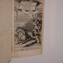 8vo. (XXVIII),917,(15 index) p. Vellum 20 cm (Ref: Schweiger 2,283/84; Dibdin 1,471: ‘in fact the best Variorum edition’; Moss 1,377: ‘a very correct and valuable edition’ and ‘This is one of the very scarcest of the Variorum editions’; Graesse 2,194; Ebert 4757; Brunet 2,88; Ernesti, Bibl. Lat. 1774, 3,201: ‘sed optima est ed. a. 1665’; Willems 1350: ‘fort bien imprimé’; Rahir 1400; Berghman 2036; Spoelder, Enkhuizen 1, p. 554) (Details: Prize copy, prize gone. 6 thongs laced through both joints. Gilt coat of arms of Enkhuizen within blind ruled borders on both boards. Engraved title depicting the rape of Proserpina, and the battle of the Giants against the gods. The notes are printed on the lower half of the pages, below the text) (Condition: Vellum varnished, the bad result is a gleaming binding with a few brownish strokes. Gilt fading. 4 thongs on the front joint broken. All 4 ties gone. Small bookplate on the front pastedown. Name on front flyleaf) (Note: This is the second edition of the works of the Roman poet Claudius Claudianus produced by Nicolaas Heinsius, 1620-1681, who was the only son of Daniel Heinsius. It was first published in 1650. Nicolaas never held any academic post. Let us see what Sandys tells about this genius: ‘His practice in versification, his wide reading in classical and post-classical Latin, and his knowledge of Greek literature made him an accomplished scholar. As a textual critic he had acquired an extensive knowledge of various readings by his study of MSS’. And: ‘In making his selection from the vast mass of variants, he was guided by a fine taste and a sound judgement acquired by long experience’. And: ‘His editions of the Latin poets laid the foundation of the textual criticism of those authors, and he has thus obtained the title of ‘sopitator poetarum Latinorum.’ (Sandys 2,323/327). Heinsius consulted, he says in the praefatio, for his first edition some 28 manuscripts, ‘viginti enim & octo fere ad manum fuerunt, ut vides’. Among these were 2 from the University Library of Leiden, and 2 from the Bodleian. Also 2 that were in the possession of the successor of Plantin, the publisher Balthasar Moretus, manuscripts that were originally used for the Plantin edition of Claudian by Pulman. (Antwerp, 1571) Heinsius rebukes Pulman for having neglected one of these, which he calls ‘insignis’ and ‘probus’. Pulman used it sluggishly, ‘oscitanter’. Heinsius consulted also 3 manuscripts which the French librarian and collector of manuscripts Alexander Petavius (Petau) had send him, one of the Royal Library, one of his own, and one owned by J.A. de Thou (Thuanus). After his edition of 1650 Heinsius continued to consult during his diplomatic travels through Europe 10 ‘bis quini’ other excellent manuscripts containing texts of Claudian. Heinsius gives in the new praefatio to this second edition, written 14 years after the first edition, ‘ante annos hosce plus minus quatuordenos’ a dazzling account of the books and manuscripts he consulted for the new edition. We also get a glimpse of the huge network of scholarly friends of which Heisius was a member. This second edition was published, so the title says, by Cornelis Schrevelius, who took his doctoral degree in Paris as a Doctor of Medicine in 1627. Hence C.S.M.D., that is Cornelis Schrevelius Medicus Doctor. He taught classics at the Schola Latina at Leiden, where he had been raised himself. In 1642 he succeeded his father, Theodorus Schrevelius, as the rector (Moderator) of the school. He died in 1664, a few days after having completed this edition of Claudian. He raised at least 11 kids, and fell victim to the plague. (A.M. Coebergh van den Braak, Meer dan zes eeuwen Leids Gymnasium, Leiden, 1988, p. 47/55); includes also his portrait). The involvement of Schrevelius in publishing a new edition of Claudian was limited to the necessary, but ungrateful task of the beast of burden. He did, so the ’typographus’ (who must be Daniel Elzevier) tells us in his short address to the reader, all that is necessary for a better understanding of Claudian, producing excerpts from the commentaries and editions of the best scholars) (Provenance: An engraved armorial bookplate on upper pastedown of one ‘Joshua Ruddock’: a crown, with 3 strawberry leaves on it, and a ‘pearl’ in the center of the leaves, on top, an eagle with spread wings. On the front flyleaf the name of Lennart Håkanson, professor of Latin Literature at the Univ. of Uppsala, 1980-1987) (Collation: *8, 2*6, A-3M8 3N2) (Photographs on request)