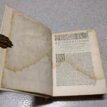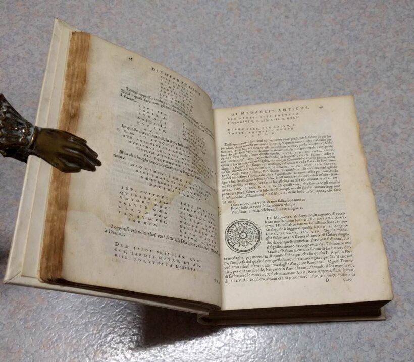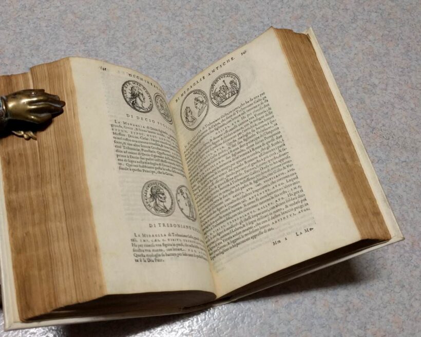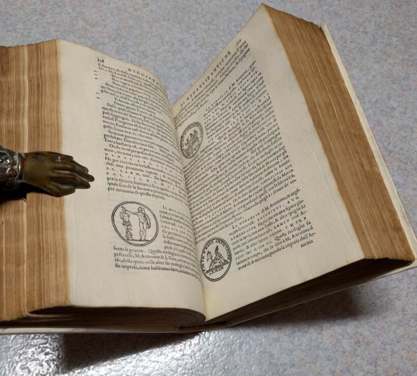 4to. 2 parts in 1: (XVI),572;282 p., numerous woodcut illustrations. Modern 20th century vellum. 22 cm (Ref: Edit16 CNCE 18279: ‘non prima del 1584′; Graesse 2,498; Ebert 6901; Brunet 2,1047) (Details: Modern vellum in antique style. Back with 3 raised bands. Boards panelled. Title within woodcut symmetric architectural borders. The printer’s mark is a crowned double-tailed Sirene (Sirena bicaudata), who holds the end of her tails in her hand. (This creature from medieval mythology was chosen in 1971 as logo of Starbucks. The poor creature has been revised several times to simplify it and remove any obvious nudity) Numerous woodcut illustrations in the text of coins and medals) (Condition: Upper half of first 180 pages waterstained; margins of the title thumbed) (Note: The The Italian Renaissance scholar ‘Messer’ Sebastiano Erizzo was born in 1525 in an illustrious Venetian noble family. He received a thorough humanistic education, and achieved full mastery of Latin, and an excellent knowledge of Greek language and literature. He became a member of the Venetian Council of Ten. The reputation of his remarkable coin collection brought many visitors to Venice. He became an expert in the field, and a master of the science of numismatics, which was still in an embryonic state. In 1559 he published his first edition of ‘Discorsi’ on the coins and medals of the ancients. Accompanied by numerous engravings this work aims at presenting a history of Roman coinage of the Republican and Imperial period, extending until the age of Probus. The display of religious and military insignia, architecture, ceremonies, gestures, faces, hierarchies, tools, weapons, animals, garments, sacrifices constitute a very effective source of information on Roman antiquity, he argued. He died in Venice 1585. (Dizionario Biografico degli Italiani (1993)) Erizzo is also known for his his novel ‘Sei Giornate’ (Six Days) published in 1567. It consists of 6 ‘Giornate’ of 6 stories each. The narrators are students of the University of Padua, who meet in a delightful garden on 6 successive Wednesdays in the months June and July, 1542. The stories are moralizing in character, and there is an almost total absence of amorous themes) (Collation: Quarto in 8 leaves. a8, A-2N8 (minus leaf 2N7 & 2N8); A-S8 (leaf S6 blank; minus leaves S7 & S8)) (Photographs on request)