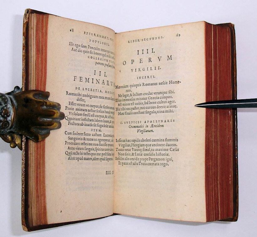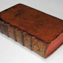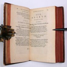 12mo. (VIII),191,(1 blank); 491,(1 blank) p. Calf 13 cm. The first edition which bears any resemblance to what is now the Anthologia Latina (Ref: Schweiger 2,6 (under Anthologia Latina); Graesse 2,486; Ebert 6804: ‘very scarce and interesting’; Brunet 2,1017: ‘recherché et assez rare’) (Details: Back gilt elaborately, and with 5 raised bands. Red morocco shield in the second compartment. Woodcut printer’s mark on title, depicting within a wreath a scepter and three crowns, the motto is hic labor. Edges dyed red. At the end, between 2K and 2L, a gathering has been inserted with signature 2K7-2K14, adding a panegyric of Porphyrius, a letter of Porphyrius to the emperor Constantine, a letter from Constantine to Porphyrius, and ‘Phoenix incerti auctoris’, from a codex owned by the French scholar and collector of manuscripts Franciscus Iuretus, or in French François Juret) (Condition: Wear to the extremities of the binding. Front joint slightly cracking, corners grazed. Some faint foxing. Small ownership inscription in ink on the verso of the first flyleaf) (Note: In 1590 the French scholar and jurist Pierre Pithou, latinized as Petrus Pithoeus, 1539-1596, published this Epigrammata et poematia vetera, which includes much material from the Codex Thuaneus, (B). Many epigrams and poems were published here for the first time. Pithou’s edition is the first which bears any resemblance to what is now called the Anthologia Latina, an anthology or libellus of epigrams compiled around 500 A.D., probably in Vandal North Africa. There are four main manuscripts which form the basis of what is known as the Anthologia Latina. One of them, now indicated as B (Paris lat. 8071), was written in central France in the ninth century, and was once owned by Jacques de Thou, whence its usual name of the Codex Thuaneus. It was used by Pithou for this present 1590 edition. The existence of the most important manuscript for the Anthologia Latina, the Codex Salmasianus, was unknown in Pithou’s time. The term Anthologia Latina is a ‘modern designation, and derives from P. Burman the Younger’s edition and specially his treatise which preceded it, the Specimen novae editionis Anthologiae Latinae. These works were published in Amsterdam between 1747 and 1773 (…)’. Anthologia Latina was then the title Alexander Riese gave to his two-volume Teubner edition of 1869/70′. (Epigrams from the Anthologia Latina: Text, Translation and Commentary (by) N.M. Kay, London 2006. p. 20) Pithou arranged his selection in four books, Ad sacra et mores pertinent, Elegia, Epitaphia and Miscellanea et amissa. ‘His anthology nicely illustrates the major dilemma which (…) forces itself upon editors of this corpus (…) namely that of arrangement: confronted with diverse types of poetry originating from different mss., written by different authors (often anonymous) at different dates, should an editor try to impose order by subject matter (as Pithou chose), by date of composition, by author, by manuscript, or in some other way?’ (Idem, p. 21) The edition of Pithou was reissued in 1596 (Lyon) and 1619 (Geneva). § Pithou, who owned a fine library, including an important collection of manuscripts, furthermore ‘produced the first important text of Juvenal and Persius (1585) (…) and the editio princeps of Phaedrus (1596), the Pervigilium Veneris (1577), Salvianus (1580), and the Edict of Theodoric (1579) (…) He narrowly escaped death in the massacre of St. Bartholomew (1572) and became a Catholic in the following year’. (Sandys, 2,192)) (Provenance: Inscription on the verso of the front flyleaf: ‘Précieux recueil pub. par Pithou. Je l’ai trouvé le 29 fevrier 1840, rare et précieux. Voyez La Biblioth. de Colomies ed. de 1731, p. 265, et le Dict. bibliogr. de Brunet’. Alas, no name) (Collation: *4; A-H12 (leaf H12 verso blank); 2A-2T12, 2V6. 2X12 (leaf 2X12 verso blank) (Between 2K and 2L a gathering has been inserted bearing the signature 2K7-2K14)) (Photographs on request)