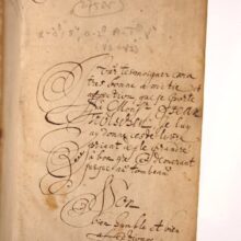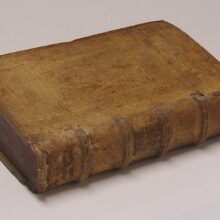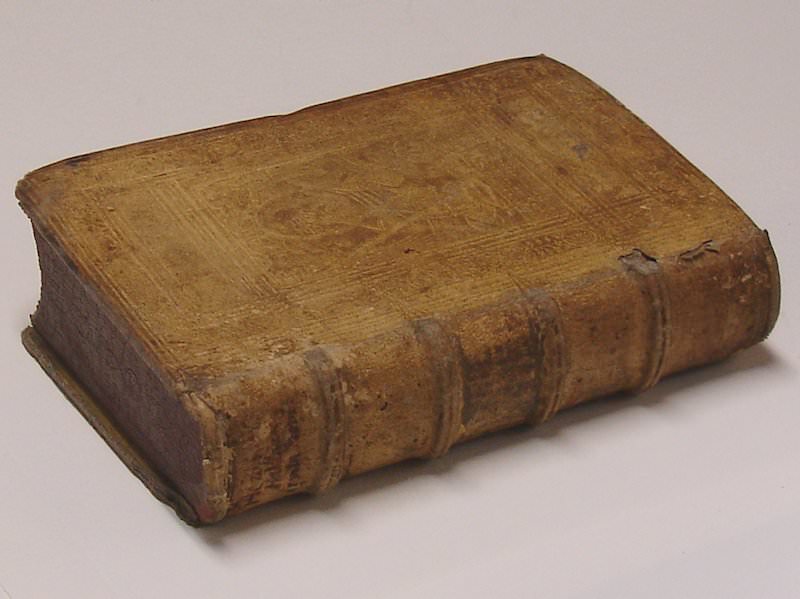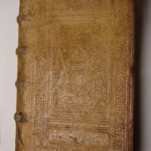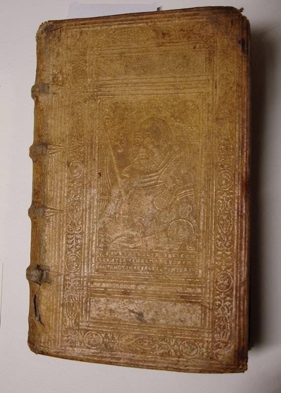 8vo. LXXII,592,(88) p. Pigskin 18.5 cm (Ref: VD16 H 2515. Weitere Nummern: VD16 C 6157, VD16 E 4005, VD16 H 2533; Hoffmann 2,236; Graesse 3,256; Ebert 9560, but see also 9542) (Details: Latin translation only. The binding of this book is important in the context of the cultural history of Lutheranism. The binding dates from the last 2 decades of the 16th century. The back has 4 raised bands. The boards are decorated with blind stamped triple fillet borders and a row consisting of floral motives and some tiny portraits. The central panel of the upper board shows a fine example of a well preserved portrait of Johann Friedrich I, the Magnanimous (der Grossmüthige), Elector of Saxony (Kurfürst und Herzog von Sachsen), 1503-1554, in full armour, with 3 lines of text at the bottom: ‘Victus eras acie, fidei con / stantia tandem victorem / ante homines fecit et ante deum’; on the lower board the blindstamped impressive and also well preserved coat of arms of this Elector of Saxony, who became after his death a kind of protestant Saint. He still is, for the 3rd of March, the day he died, is still commemorated in the evangelical church of Germany. Because the portrait of this nobleman also figures on a book held in the Penn Libraries, where it is described as ‘Elector of Saxony, possibly August I, 1526-1586′ (Cicero, Philosophical works, 1565, copy in Rare Book & Manuscript Library, Call no.: LatC C4855.10 1565), we will investigate this in some detail. Johann Friedrich I was an ardent follower of Martin Luther, with whom he corresponded. He was a lifelong promotor of the reformatory movement, and one of the movement’s most important political leaders. Johann Friedrich was defeated and taken prisoner on the 24th of april 1547 by troops of the emperor Charles V in the neighbourhood of Mühlberg (battle of Mühlberg), ‘mannhaft fechtend, am Backen verwundet’. (On this wound on the cheek and the resulting scar, see below) On the 10th of May he was sentenced to death. ‘Eben mit seinem Schicksalgefährten Herzog Ernst von Grubenhagen, beim Schachspiel sitzend, hörte J.Fr. wie erzählt wird (…) das Urtheil mit grossem Gleichmuth an; ‘Pergamus’ wandte er sich zu seinem erschrockenen Mitspieler’. This sentence was not carried out. Johann Friedrich had however to abdicate, but he refused to be converted to Catholicism. In captivity his political role came to an end, but in prison he became a protestant Saint. ‘Mit diesem jähen Sturzen, war Johann Friedrichs politische Rolle zu Ende. Nicht aber seine politische Bedeutung für das evangelische Deutschland. Die heitere Ruhe mit dem er sein Unglück hinnahm, die Unerschütterlichkeit seiner religiösen Überzeugung (…) machten ihn zum leuchtende Vorbilde seiner Glaubensgenossen (…)’. Charles V tried to force him to accept catholicism, he humiliated him, but ‘Alles, erklärte er (J.Fr.), habe er bisher hintangesetzt, um das Wort Gottes lauter und rein zu erhalten. Obwohl er bereits Alles verloren und ein armer Gefangener geworden, solle ihn doch Gott davor behüten, dass er nun zu letzt noch davon abweichen, die erkannte Wahrheit verleugnen, und das Papstthum annehmen solle’. The duke was released in 1552, and his way home was a real triumph. ‘Die Heimkehr des fürstlichen Martyrers über Nürnberg und Bamberg glich einem Triumphzuge; wohin er kam, strömte das Volk ihm entgegen. (…) Zu Jena empfingen ihn Professoren und Studenten der neubegründeten Universität’. (…) Melanchthon wrote after his death: ‘Die Bekenntniss und Beständigkeit Herzog Johann Friedrichs, hat unsere Kirche mehr gefrommt, als vielleicht die Victoria hat dienen mögen’. (German quotations: ADB 14 p.326/330) In 1551 Matthes Gebel made a medal with the portrait of a bearded duke, with a clearly visible scar on his left cheek. There is also an engraved portrait with a scar made in 1547, the year of the battle of Mühlberg. This scar on the left cheek, which is apparantly part of the iconography of the Duke, is also clearly visible on the blindstamped portrait on the front of this book. So our conclusion must be that this portrait belongs to Johann Friedrich I. The coat of arms on the backcover was made after an engraving of Lucas Cranach, a friend of Johann Friedrich. In Jena there is a statue of Johann Friedrich, the socalled ‘Hanfried-Denkmal’ to commemorate the founding of the University in 1558, of which Johann Friedrich had been the driving force. The ‘Deutsches Historisches Museum’ holds a number of paintings (1630), which depict the life of this protestant Saint in 28 scenes. § Wechel’s woodcut printer’s mark on the title, depicting the winged horse Pegasus gracefully arched over a caduceus and 2 intertwined cornucopiae) (Condition: Cover soiled and worn at the extremities. Some damage to the head and tail of the back, and to the upper board. Corners heavily bumped. 2 old ownership inscriptions on the title. Small inscription with references to Cicero on the front pastedown. Small inscription on the verso of the title. Occasional old red ink underlinings. Occasional marginalia in the Apologia, probably made by Christoph Richter (see below) (Note: This book is a reissue of a revised Latin translation of Herodotus’ ‘Historiae’, made by Lorenzo Valla, and published by the French humanist/scholar Henri Estienne, or in Latin Henricus Stephanus, in Geneva in 1566. Stephanus plays an important role in the history of the reception of Herodotus. In 1474 the Latin translation of Valla was first published. 1502 saw the ‘editio princeps’ of the Greek text. In the same time the work of the detractors and critics of this Greek historian came on the market, especially Plutarch’s ‘De Herodoti malignitate’ (1509), but also works of Aristotle (Herodotus is ignorant), Flavius Josephus (he is a liar), Strabo (he likes to tell simple stories), Lucianus (does not tell the truth), Gellius (he invents stories). The supporters o