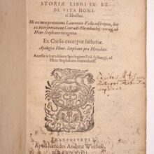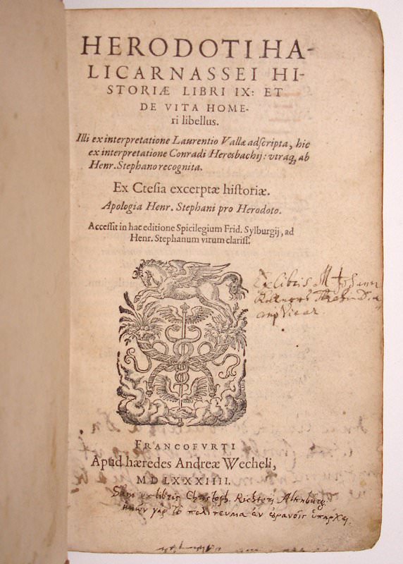 Herodoti Halicarnassei Historiae libri IX: et de vita Homeri libellus. Illi ex interpretatione Laurentio Vallae adscripta, hic ex interpretatione Conradi Heresbachii; utraque ab Henr. Stephano recognita. Ex Ctesia excerptae historiae. Apologia Henr. Stephani pro Herodoto. Accedit in hac editione Spicilegium Frid. Sylburgii, ad Henr. Stephanum virum clariss.