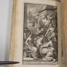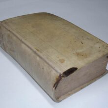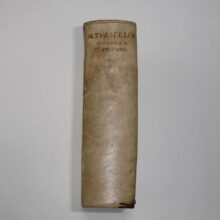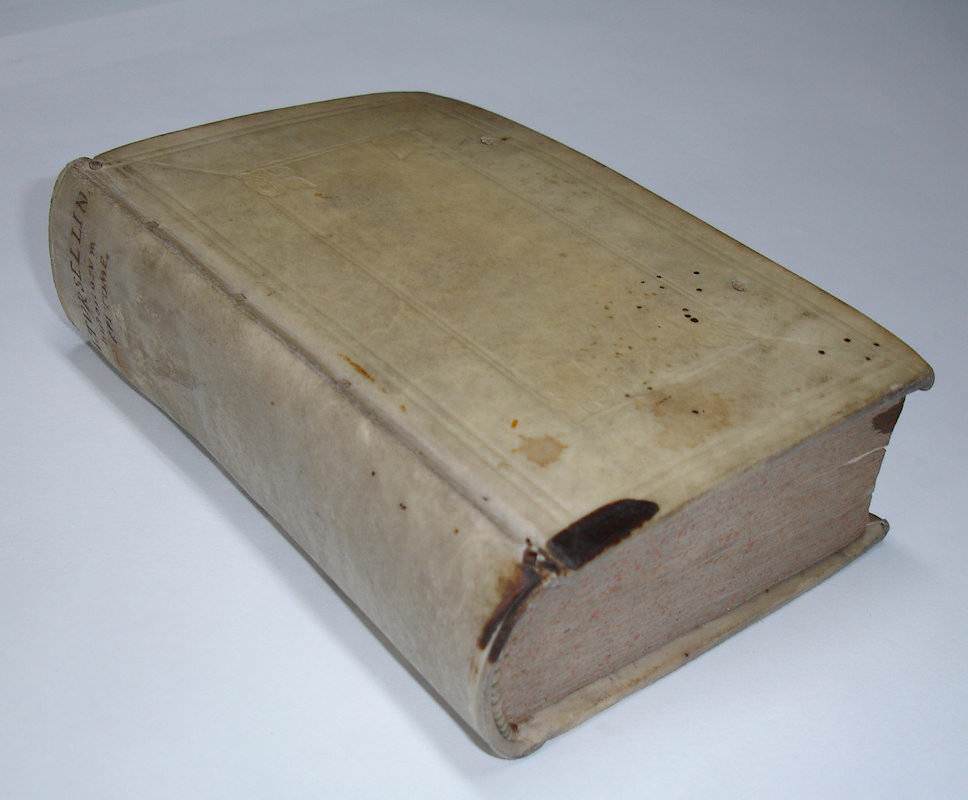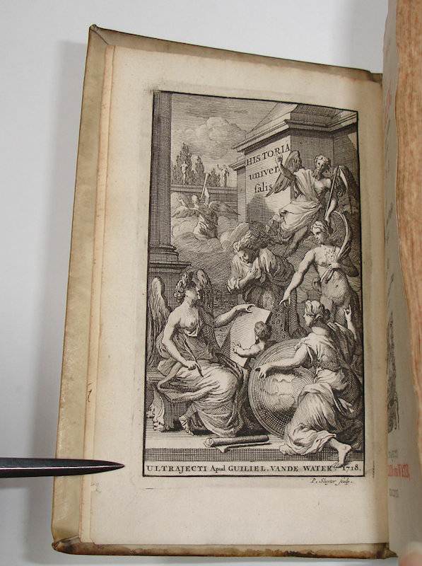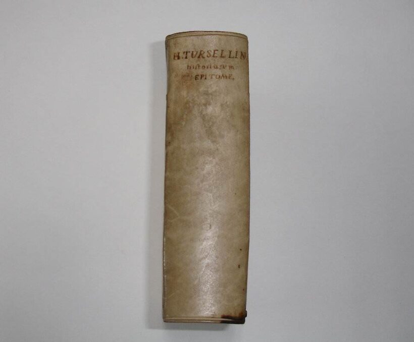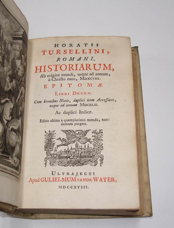 8vo. (XVI),566,(74 index) p., frontispiece. Vellum 16.5 cm (Ref: cf. Graesse 6/2,216) (Details: 5 thongs laced through the joints. Boards blind tooled. Frontispiece engraved by P. Sluyter, probably depicting the Muse Clio, a winged woman with a quill in her hand and a laurel wreath on her head; she is visited by several allegorical figures, such as Father Time, and a naked woman with a palm branch (Victoria?) in her hand; in the background is Fama, who blows her horn. Title printed in red and black. Woodcut printer’s mark on the title, depicting Fama hovering above a city, the motto is: ‘Pax artium altrix’) (Condition: Vellum somewhat soiled ans spotted. Small inkstain on the front board. All four ties gone) (Note: Not much is known about the Italian Jesuit scholar Orazio Torsellini, or Orazio Torsellino, latinized as Horatius Tursellinus, 1545-1599. Tursellinus taught at several Jesuit Colleges in Italy, and lectured for 20 year at the ‘Collegium Romanum’ in Rome. His most important works are De particulis latinae orationis, a biography of the Jesuit missionary Franciscus Xaverius, published in 1596, and a universal history Epitome Historiarum libri X which treated in 10 books the complete history, from Adam till 1598, and which remained popular for centuries on schools and universities. For a long time it was used even at the protestant universities in the Dutch Republic. 100 or more editions and adaptations were produced until 1845. Right from the start it was a success, and became a standard. The book was reissued in Italy in Rome, Venice, Milan and Perugia, in France in Douai, Lyon, Paris, Rouen, Caen, Toulouse, and in Germany in Cologne, München and Frankfurt, generally cities where Jesuits had their colleges. The first edition in the Low Countries appeared in The Hague in 1678, and was edited by Johann Conrad Nuber, who introduced this manual at the University of Leiden. In 1688 and in 1695 it was reissued in Franeker, followed by editions produced by the Utrecht printer W. vande Water in 1710, 1718, 1730 and 1744. In 1708 a Dutch translation was published in Amsterdam. The manual was published for the last time in The Low Countries in 1786. The continuatio till 1624, incorporated in this edition of 1718, was produced by the French historian Henri de Sponde (Henricus Spondanus), and adopted from his Annales Baronii. (See for Tursellinus: H.W.A.M. Sancisi Weerdenburg, ‘Lege veteres, sperne recentiores : Tursellinus en het achttiende-eeuwse geschiedenisonderwijs’, in Utrechtse Historische Cahiers, Jaargang 17, (1996) 1: ‘Studeren en promoveren in Utrecht’, p. 22/35; and also ‘Biographie Universelle, ancienne et moderne’, Paris, 1826, vol. 46, p. 233/4). § This historical work is of course outdated, but nowadays every classical scholar still knows Tursellinus, which is to say, that he/she knows and sometimes uses: ‘Tursellinus seu de particulis Latinis commentarii’ in the edition that was published by the German scholar Ferdinand Gotthelf Hand, Leipzig 1829/45, and later reprinted by Hakkert in 1969. This work, first published in Rome as De particulis latinae orationis, and brought Tursellinus fame among classical scholars. It offered the student of eloquence the means to speak coherently by the correct use of those small particles and adverbs which glue his speech together. Tursellinus his highly praised by H.J. Sandys for his accurate scholarship) (Collation: pi1, *8 (minus leaf *8 = pi1), A-2R6) (Photographs on request)