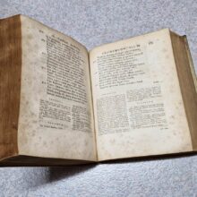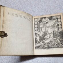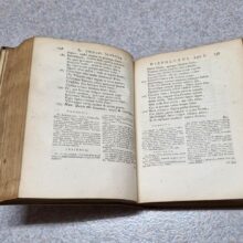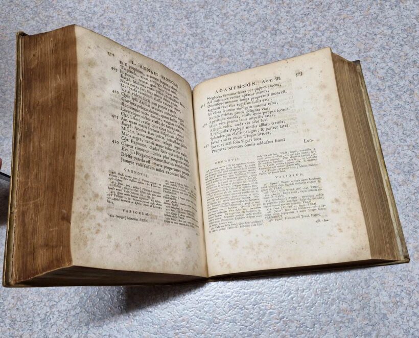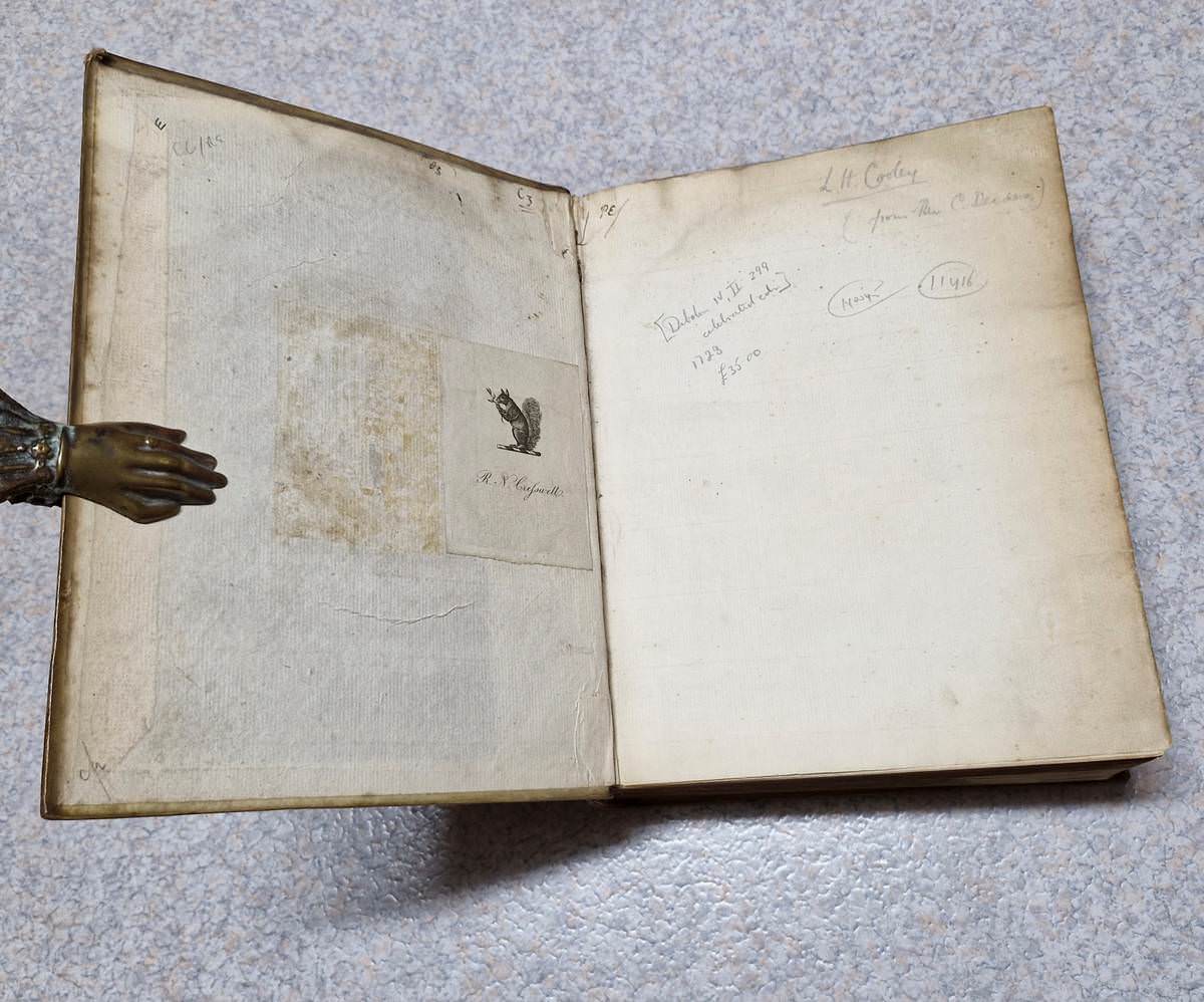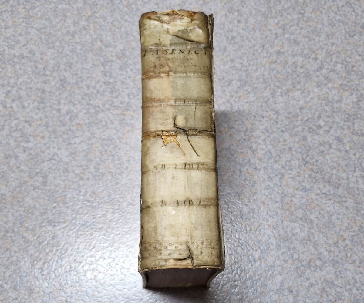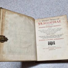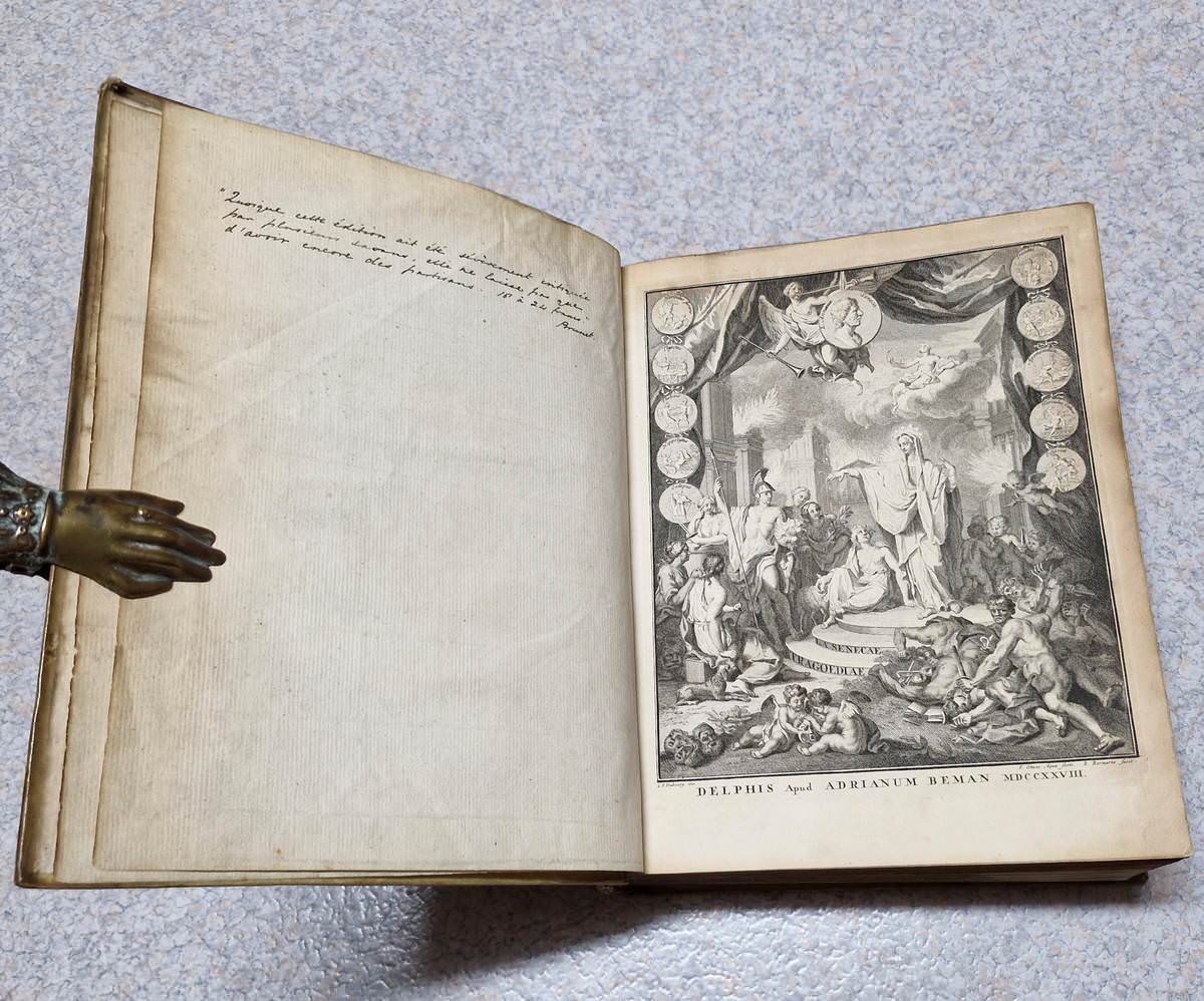 4to. (XXIV including frontispiece),(98),802,(214 index) p. Vellum 27 cm (Ref: STCN ppn 14155522X; Schweiger 2,941; Dibdin 2,399: ‘a very elaborate and celebrated edition’; Fabricius/Ernesti 2,136/37; Brunet 5,286; Moss 579/80: ‘its merits are highly and justly appreciated’; Graesse 6/1,359; Ebert 20942; Ter Meulen/Diermanse 540) (Details: Back with 6 raised bands. Boards with blind double fillet borders, and a blind stamped oval ornament in the center. Frontispiece designed by L.F. Dudourg and executed by F. Ottens and B. Bernarts, depicting some scenes from the tragedies. Title printed in red & black. Upper part of the page has the Latin text, the lower part the commentary) (Condition: Vellum soiled. Back cracked and damaged, partly discoloured; its head repaired with chemical glue. Both joints are split, but strong. Paper partly foxed, yellowing and browning. Bookplate on the front pastedown) (Note: There is ‘widespread agreement that Seneca’s tragedies are important dramas and that the question whether they were composed for recitation or for performance is largely irrelevant. (…) Modern opinion is divided over the extent of Stoic doctrine in them; the majority incline toward judging them solely as dramas. Knowledge of the tragedies was spotty in late antiquity; (…). The earliest complete manuscript is the Codex Etruscus from Italy in the 11th century. It was read by Poliziano and was the basis of the edition of J.F. Gronovius (Amsterdam 1661), the first reliable printed text. The ‘editio princeps’ was printed at Ferrara in 1484; the first edition with a critical text and commentary of any value was that of Jodocus Badius (Paris 1514), which included the conjectures of Erasmus. (…) Seneca was by far the most important classical model for Renaissance tragedy, at a time when Greek tragedy was hardly known. (…) There is philosophical reflection, especially in the choruses, but that is not their main purpose, and there is psychological subtlety, despite the rhetoric. (…) Julius Caesar Scaliger in his ‘Poetices’ maintained that Seneca surpassed the Greek tragedians in dignity (‘maiestas’) and had greater polish and brilliance (‘cultus ac nitor’) than Euripides. (The Classical Tradition, Cambridge Mass., 2010, p. 876) § This 1728 edition of the tragedies of Seneca is based on the Amsterdam edition of Gronovius of 1682. It offers the entire notes of the Dutch scholar of German origin Johannes Friedrich Gronovius, 1611-1671, who was professor of Greek at the University of Leiden, and the selected notes of Lipsius and of many other scholars, among whom Hugo Grotius. Seneca owes more to Gronovius than to all the preceding editors. His edition marked the beginning of a new age in Senecan scholarship. His commentary is superb, and he greatly amended the text. § This so-called ‘Variorum’ edition of 1728 was produced by the Dutch schoolmaster Johannes Caspar(us) Schröder(us), who was Rector of the ‘Schola Latina’ at Delft. He added also notes of his own, which are according to Dibdin ‘frequent and judicious’, but according to Schweiger ‘weder zahlreich, noch besonders werthvol’. A ‘Variorum’ edition offers a ’textus receptus’ which is widely accepted, accompanied with the commentary and the annotations of various specialists, taken, or excerpted from earlier useful, normative or renewing editions. Editions like these, ‘cum notis Variorum’, were useful, but never broke new ground. The production was the specialty of Dutch scholars of the 17th and 18th century.) (Provenance: Engraved bookplate on the front pastdown of ‘R.N. Cresswell’, above the name a squirrel cracking a nut. This might well be the member of the landed gentry and member of the English bar R.N. Cresswell, Esq. Barrister-at-Law, once, in 1844, working at the Insolvent Court, London. The squirrel figures in the coat of arms of that family. § On the front flyleaf in pencil ‘L.H. Cooley, from Rev. C. Dea….’) (Collation: pi1, *-3*4; a-m4, n1; A-6M) (Photographs on request) (Heavy book, may require extra shipping costs)
