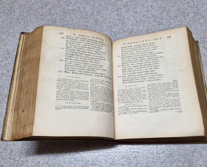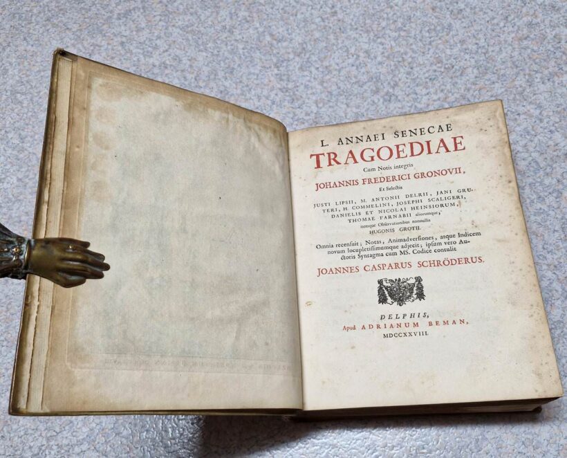 L. Annaei Senecae Tragoediae, cum notis integris Johannis Frederici Gronovii, et selectis Justi Lipsii, M. Antonii Delrii, Jani Gruteri, H. Commelini, Josephi Scaligeri, Danielis et Nicolai Heinsiorum, Thomae Farnabii aliorumque, itemque observationibus nonnullis Hugonis Grotii. Omnia recensuit, notas, animadversiones, atque indicem novum locupletissimumque adjecit; ipsum vero auctoris syntagma cum MS. codice contulit Joannes Casparus Schröderus.