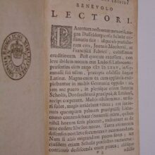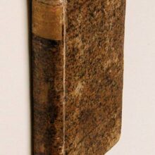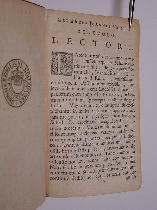 3 volumes in 1. (VIII),175,(1 blank);176 p. Eighteenth century boards. 16 cm (Details: First title printed in red & black. Woodcut printer’s mark on all 3 titles, depicting a farmer and a man with a Jacob’s staff before his eye, between them a celestial sphere, above them Fama blowing 2 trumpets, motto: ‘Vivitur ingenio’, short for ‘Vivitur ingenio, caetera mortis erunt’, ‘one lives on by the spirit, the rest shall belong to death’) (Condition: Cover scuffed and worn at the extremities. First title dustsoiled, with an ownership entry on the blank upper margin; a very small spot (0.5×1 cm) on the title superficially worn away. 2 small biographic clippings neatly tipped in on the front pastedown. A few old ink underlinings. One marginal well succeeded paper repair. Library stamp on verso of title. Paper yellowed) (Note: This Latin grammar was commissioned in 1625 by the Provincal Governments of Holland and West-Frisia (Staten van Holland) for the use in local Latin schools in the Western part of the Dutch Republic. It was produced by the Dutch classical scholar Gerardus Johannes Vossius, 1577-1649, according to Sandys the greatest polyhistor of his age. In 1622 he was appointed professor of Eloquence at Leyden, and in 1631 he accepted the professorship of History at Amsterdam. His Latin grammar remained the standard grammar on Dutch schools untill the middle of the 19th century. In 1625 the ‘Staten van Holland’ decreed, that the same set of rules should apply to all public schools in their provinces. The schools should have the same order of classes and lessons, the same schedule, authors and exercises. It was decided that uniform schoolbooks, grammars and sound texts were needed. (E.J. Kuiper, ‘De Hollandse ‘Schoolordre’ van 1625′, Groningen, 1958, p. 80) The ‘Staten of Holland’ wanted to improve education at the Latin-schools, which prepared for the University, for the standard of education and discipline had got worse because of the Eighty Years’ War. The grammar was first published in 1626, and found the next 2 centuries numerous new and revised editions. The first volume contains the latina etymologia, the second the latina syntaxis, the third the latina prosodia) (Provenance: Library stamp on verso of title: ‘Grosherzogliche Bibliothek Neustrelitz’. ‘Die 1796 gegründete Herzogliche, später Grosshezogliche Bibliothek Neustrelitz umfasste zunächt die private herzogliche Büchersammlung und enthielt 1829 etwa 50.000 Bände. Dieser Bestand wurde in den nächsten 50 Jahren kaum vergrössert. (…) Für 1875 werden sehr unsicheren Schätzungen – die Bibliothek war unterbesetzt – 60.000 bis 70.000 Bände angegeben, erst ab 1894 erhöht sich diese Zahl auf 100.000. Obwhol der Philologe Friedrich Latendorf (1831-1898) den Wert der Bibliothek für das geistige Leben des Landes immer wieder betonte (…) musste er feststellen, dass wichtige Werke fehlten, Disziplinen wie Medizin und Juristerei fast völlig vernachlässigt waren und der Bibliothek seit ihrer Gründung der Charakter des Zufälligen anhaftete’ The schoolboy Heinrich Schliemann saw in the underpaid librarian Carl Andress, ‘der offenbar kein abgeschlossenes Studium (Literatur, alte und neue Sprachen) besass’, ‘einer der gelehrtesten Männer Deutschlands’. (U. Hass-Zumkehr, ‘Daniel Sanders: Aufgeklärte Germanistik im 19. Jahrhundert’, Berlin/New York 1995, p. 307/08) The library had in 1920 132.000 volumes. In 1950 the library was ‘aufgelöst und ihre Bestände auf acht Bibliotheken und Museen in Schwerin, Greifswald, Rostock und Berlin aufgeteilt worden. Mit dieser Aktion ging der betroffenen Region eine unersetzbare Quelle der kultur- und regionalgeschichtlichen Forschung verloren’. (B. Fabian, Handbuch der historischen Buchbestände in Deutschland (online)) (Collation: *8, A-L8 (leaf L8 verso blank); a-l8) (Photographs on request)