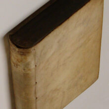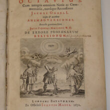 4to. (38),44,(2),46,140,36,32,212,(23),56 p. Overlapping vellum 20.5 cm (Ref: STCN ppn 840085141; Breugelmans 1652:10B; Schoenemann I,71; not in Brunet; Graesse 4,534; Ebert 14107) (Details: Title in red & black. Engraved printer’s mark on the title depicting a farmer stamping a shovel into the ground, he is flanked by a woman holding a cornucopiae, and a woman holding an ancre, above the head of the farmer the motto: ‘fac et spera’. According to Breugelmans there are 2 issues of this edition: 1652:10A and 1652:10B; 10A shows on the title 3 lines printed red, and 10B (our copy) has 5 lines printed red; 10B also has 2 cancels (leaves *2 and E4); in our copy these 2 leaves have not been cancelled; our copy is conform the copy in the University Library of Leiden, UBL 503 C 2) (Condition: Cover somewhat soiled. Small ink stain, only touching the top of the right upper corner of the first 30 pages; small ownership inscription on the title. Some gatherings browning. Some small spots of paper near the inner gutter of the front pastedown eaten away; our copy lacks leaf pi2, the leaf after the title, showing the table of contents) (Note: The Octavius is a dialogue in defence of the christian religion, and perhaps the oldest literary work of christian Latin. It was written by Minucius Felix, who lived in the second or third cent. A.D. In it he tries to prove that christian principles were not contrary to pagan culture, and that the Greek and Roman philosophers paved the path for christianity. The inspiration seems to come from Cicero’s dialogue ‘De Oratore’. The dialogue starts with Minucius recollections of the friendship he had with the recently deceased christian advocate Octavius. The setting is Ostia, ‘amoenissima civitas’ (1,2). Minucius, Octavius Januarius, and the heathen Caecilius have come there to enjoy their holiday, free from ‘iudicariam curam’. Caecilius then launches a vehement attack upon the christians and their doctrines. It is the opinion of Octavius that no honorable Roman should leave a friend in the darkness of ignorance. He ridicules the folly of heathen fables, and proves the existence of providence and of God. Octavius warmly praises the purity, courage and other virtues of the christians. At the end Caecilius acknowleges himself vanquished and converted. § Jacobus Ouzelius (Oiselius), 1631-1686, born as Jacques Oisel (Oesel) in Dantzig, was only 21 when he edited this book. Although destined for a commercial career, he chose to study classical literature in Leyden. Later he switched to law and became professor of law in Groningen. He also edited Gaius and Gellius. (Van der Aa, vol. 14, p. 59) Ouzelius says in the ‘praefatio’ that he hopes that the reader will forgive him any mistakes, without ‘livor’ and ‘maledicentia’. He dedicates the book to Queen Christina of Sweden. Well, if we may believe Schoenemann, Christina had reason for complaint. Schoenemann is very critical about Ouzelius. He calls him a ‘futilissimus commentator’. ‘Omnia apta inepta incredibile stupore et imprudentia corrosa sunt’. The value of this edition lies in the printed commentaries of previous commentators. The reader should skip the 212 p. filled with notes by Ouzelius, and consult the presented notes of Nicolaas Rigaltius (32 p.), or Desiderius Heraldus, or the ‘liber commentarius ad M. Minucii Felicis Octavium’ by G. Elmenhorst (140 p.), or the notes of J.A. Wouwer (46 p.). Nic. Rigaltius, (Rigault) 1577-1624 (See Sandys 2,283); Desiderius Heraldus, ca. 1579-1649, professor of Greek at Sedan (See Sandys 2,287). J.A. Wowerius, 1574-1612, was a pupil of Scaliger, and helped him with his Petronius edition. Wowerius published his edition and commentary earlier in 1603 at Copenhagen (See Sandys 2,287). Elmenhorst published in 1612 at Hamburg a text and commentary on Minucius Felix (See Schoenemann I,71). § At the end has been added ‘De errore profanarum religionum’ by Julius Firmicus Maternus, edited by Wowerius, with his commentary. Firmicus lived in the 4th century A.D. In this work he urges the emperors Constans and Constantius, both sons of Constantine the Great, the man who in 313 A.D. had declared christianity to be the state religion, to abolish paganism) (Provenance: Engraved armorial bookplate (with ducal coat of arms?) on the front pastedown: ‘Bibliothek Oberherrlingen, 1839’ with the initials ‘E. M.’ on it of Eugen, Freiherr von Maucler, 1783-1859. The name of Paul Friedrich Theodor Eugen Maucler is connected with the legislation of the kingdom of Württemberg under ‘König Wilhelm’. In 1818 he became minster of justice. His legislative work gave him great influence. He was hated by the liberals and resigned in 1848. (ADB 20, p. 687-688) Having bought ‘Schloss Herrlingen’ Maucler had room enough to build a huge library. Libraries all over the world hold a host of valuable incunabula and 16th century books from his library. The incunabula were sold at the beginning of last century) (Collation: pi1 (lacking leaf pi2) *2, 2*-5*4, A-E4 F2; A2 B-F4, G2; a2 b-3k4; A-G4) (Photographs on request)