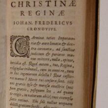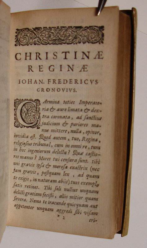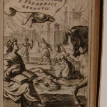 16mo. (VIII),424 p. Overlapping vellum 12 cm (Ref: This edition is ’the most significant stage in the evolution of the printed text of the Thebaid before the late nineteenth century.’ (Berlincourt, Classical quarterly, 2016, 66 (1), p. 376-383); Willems 1166; Bergman 2139; Rahir 1189; Copinger 4491; Schweiger 2,965; Dibdin 2,424; Fabricius/Ernesti 2,335; Moss 2,612; Ebert 21682: ‘mit grossem Scharfblick und nach guten Hülfsmitteln verbessert’) (Details: Engraved title: a battle scene from the Thebaid, the city of Thebes is in the background, the poet in front) (Condition: Vellum slightly soiled. Small owner’s inscription on the title) (Note: His fluent and highly polished verse brought the Roman poet Publius Papinius Statius, ca. A.D. 45-96, to the court of the Roman emperor Domitianus. He is best known for his epic, the ‘Thebaid’, which tells the story of the civil war between the sons of Oedipus, Eteocles and Polynices, contesting power over the city of Thebes. The ‘Achilleid’, tells the story of the education of Achilles. Statius’ ‘Silvae’ is a collection of 32 occasional poems addressed to his friends, celebrating their marriages etc. In his epic work there are frequent imitations of Vergil in word and thought. (OCD, 2nd e. p. 1011/12) § The Thebaid was extraordinary popular during the Middle Ages and the Renaissance. In Dante Statius even ascends to heaven. The ‘Thebaid’ was used by Boccaccio and Chaucer, and there appeared adaptations in Irish, French and Italian. Also Statius’ ‘Silvae’ enjoyed a vigorous afterlife, and set a standard for the Neolatin poets of the 16th and 17th century. Composing occasional poetry in imitation of Statius was a common pastime among humanist classicists, e.g. Heinsius, Scriverius, Meursius, and in England Milton and Ben Jonson. The works of Statius were ably edited by the Dutch classicist of German origin Johann Friedrich Gronov, or Gronovius, 1611-1671, He was the successor of Heinsius at the University of Leiden, and was influenced by Vossius, Grotius, Heinsius & Scriverius. His editions mark an epoch in the study of Livy, of Seneca, Tacitus & Gellius. His interest to the textual criticism of Latin poetry was due to the discovery of the Florentine MS of the tragedies of Seneca. In his riper years ’the acumen exhibited in his handling of prose is also exemplified in his treatment of the text of poets such as Phaedrus and Martial, Seneca and Statius’. (Sandys, History of Classical Scholarship, 2,321) As an editor and commentator Gronovius played a pivotal role in the history of the works of Statius. This small and light book of 1653 weighs only 120 grams, it is indeed ‘pondus non magnum’, but especially the notes are ‘satis ponderosae’, that is, really important. They fill merely 68 pages at the end of this volume, and of these pages the notes to the Thebaid fill only 41, and are concerned with little more than 200 passages. ‘Their scope is almost entirely limited to the emendation of the text of Statius’. For the Thebaid Gronovius consulted at least 11 manuscripts. ‘The place given to conjecture, though clearly subordinate, is by no means negligible. These notes often involve other aspects as well: Gronovius broad conception of emendation leads him to tackle various questions, whenever they lend support to his views. (…) In his eyes, the dignity of critical studies does not lie in emendation itself, but in the comprehensive knowledge of ancient languages and cultures in which emendation should always be grounded; such knowledge enables the scholar to get the author’s genius and thus restore the text from inside’. (V. Berlincourt, ‘In pondere non magno satis ponderosae…’ Gronovius and the printed tradition of the Thebaid’ in: ‘The poetry of Statius’, Leiden, Boston, Brill, 2008, p. 1-2. (Mnem. Suppl. 306). The Gronovius edition became during the 2 following centuries ’the undisputed foundation of almost every later edition until scholars at last began to base their work on a comprehensive study of the manuscript tradition, that is, until the second Teubner of Otto Müller in 1870′. (Berlincourt, p. 7.) Gronovius’ work exercised a great influence over later editors and commentators. ‘There is little to find fault with in Gronovius’ critical method, as illustrated by his notes, though it is of course still conceived of as being mere emendation of the textus receptus; usually his discussions are well informed, his arguments sound, and his judgement balanced’. (Berlincourt, p. 10)) (Provenance: On the lower margin of the title we read the name of one ‘I.N. Arntzenius’, ‘J.N. Arnstzenius’ or F.N. Arntzenius’) (Collation: *4, A-2C8, 2D4) (Photographs on request)