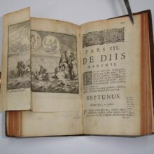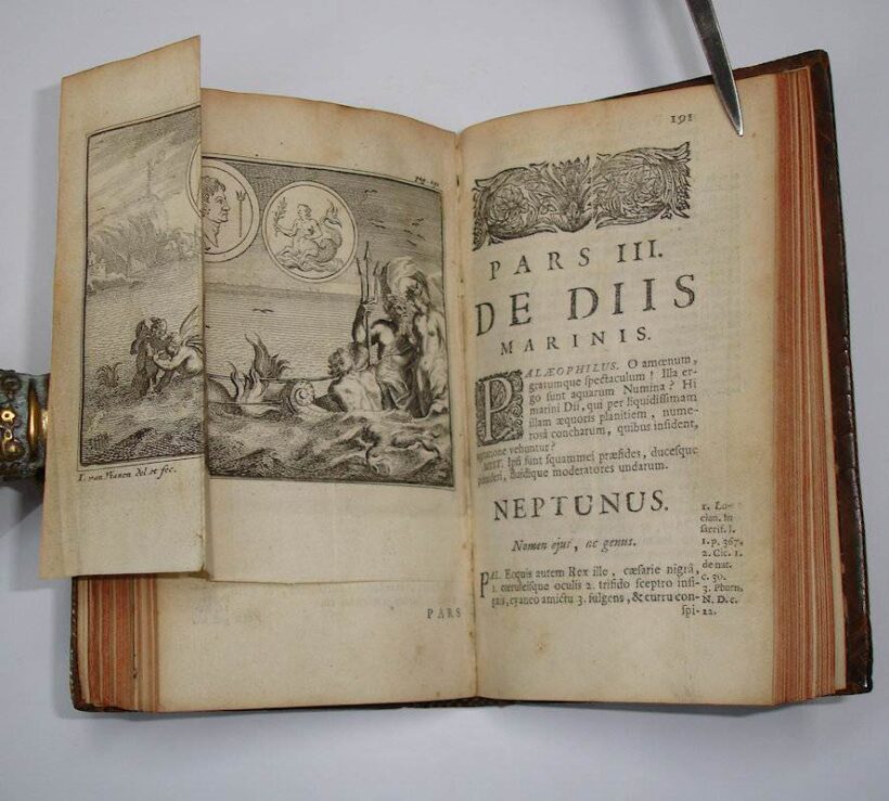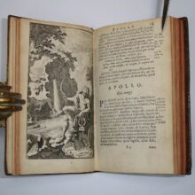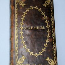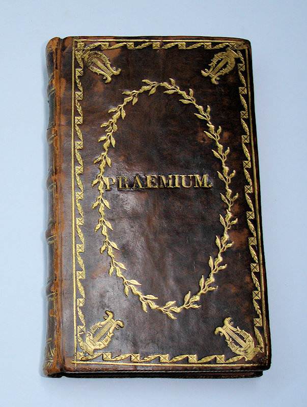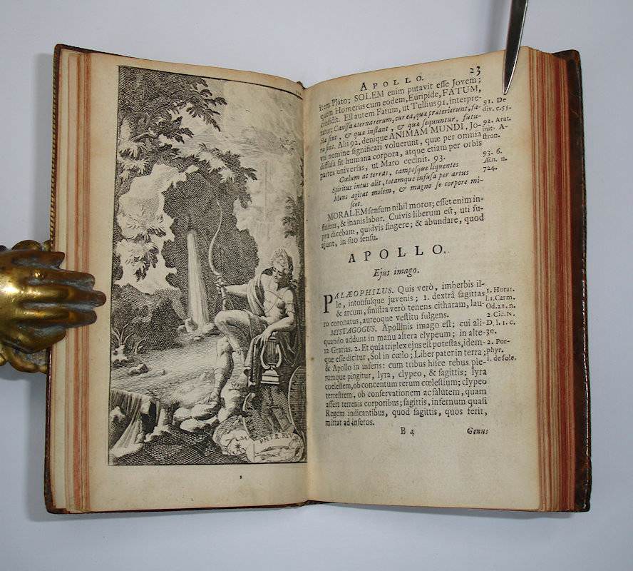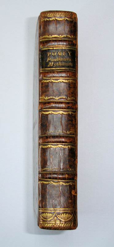 8vo. (XVI),298,(14) p., frontispiece & 26 engraved plates. Calf. 16 cm “Prize copy’ (Ref: STCN ppn 20819178X; Brunet 4,793; Michaud 34 p. 12: ‘la meilleure édition est celle qu’a publiée Sam. Pitiscus’) (Details: Prize copy, probably of a Belgian Jesuit College. Back with 5 raised bands between gilt fillets & floral rolls. Black morocco gilt lettered shield in the second compartment. Boards with gilt fillet borders. Within the fillet border a gilt row consisting of ears of corn and quadrangles. A gilt lyre in all 4 corners. A gilt oval laurel wreath with in its center the gilt text PRAEMIUM. Edges of the boards gilt. Marbled endpapers. Title in red & black. Woodcut printer’s mark on the title. Engraved frontispiece depicting deities. 26 engraved plates with mythological scenes) (Condition: Wear to extremes, back somewhat rubbed. Prize gone. Front hinge cracking, but still hanging on 2 ties) (Note: This is the 6th edition of the most popular and authoritative mythology manual of the 17th and 18th century. It was first published in Lyon in 1659. There are more than 40 editions, and it was translated into English, French, Spanish and Polish. The manual was produced by the French Jesuit schoolmaster François Antoine Pomey, 1618-1673, who lectured humanities and rhetoric at several colleges. He is also the author of a number of schoolbooks and dictionaries. His ‘Pantheum Mythicum’ became to be regarded as an essential work which provided the indispensable ornaments of formal discussion. It was also popular as a schoolbook, for the stories formed a body of moral precepts, hidden under the mask of agreable fiction. ‘Perinde quasi, alius esse debeat, cum omnibus, tum mihi maxime, ac studium & propagatio Divinae gloriae?’; In the praefatio to this 6th edition the Dutch classicist of German origin, Samuel Pitiscus (Samuel Petiski), 1636-1727, tells the reader that the publisher had sold within 4 years 1300 copies of the 5th edition of 1697. To surpass this tremendous success he asked him to produce a new edition purged from all erroneous inventions and extensions of later editors, and mistakes of ignorant printers. Pitiscus really was the expert for the job. He produced editions of several Roman historians, and did also lexicographic work. He was well acquainted with the ‘Romanae Antiquitates’ of Rosinus and Dempster, and in 1713 he published an encyclopaedic ‘Lexicon Antiquitatum Romanarum’) (Collation: *8, A-T8 V4 (Photographs on request)
