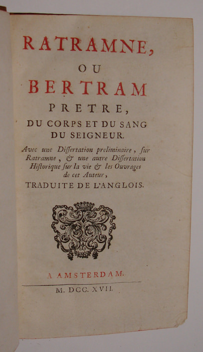 Ratramne, ou Bertram, pretre. Du Corps et du Sang du Seigneur. Avec une dissertation preliminaire, sur Ratramne, & une autre dissertation historique sur la vie & les ouvrages de cet auteur. Traduite de l’Anglois.