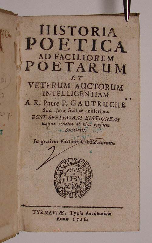 Historia poetica ad faciliorem poetarum et veterum auctorum intelligentiam; a R. Patre P. Gautruche soc. Jesu Gallice conscripta. Post septimam editionem latine reddita ab Uno eiusdem Societatis. In gratiam Poetices Candidatorum.